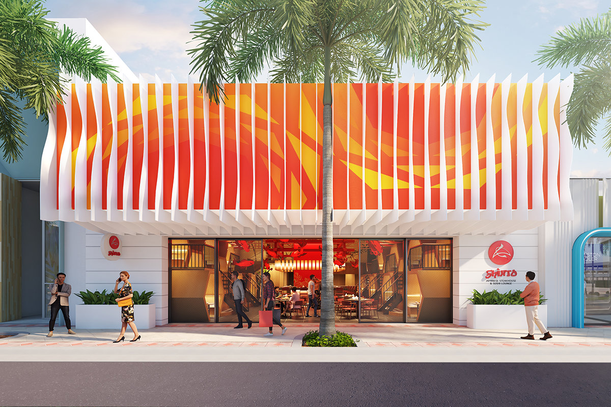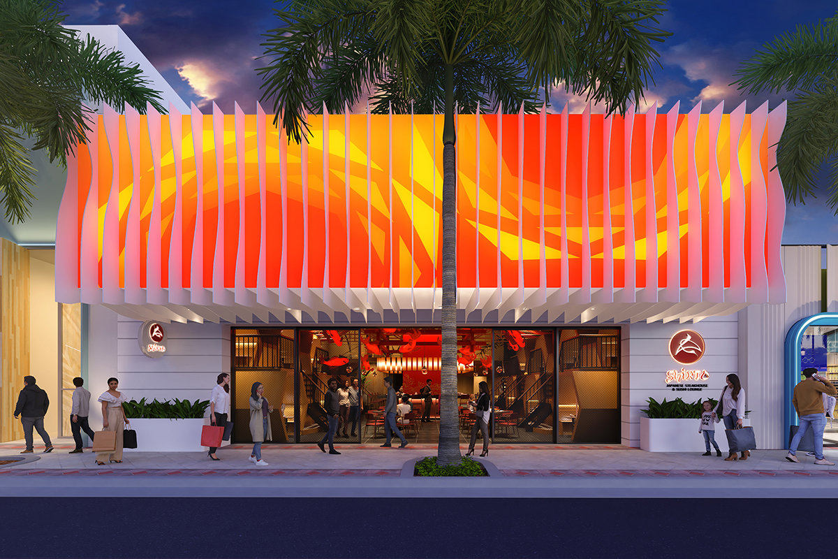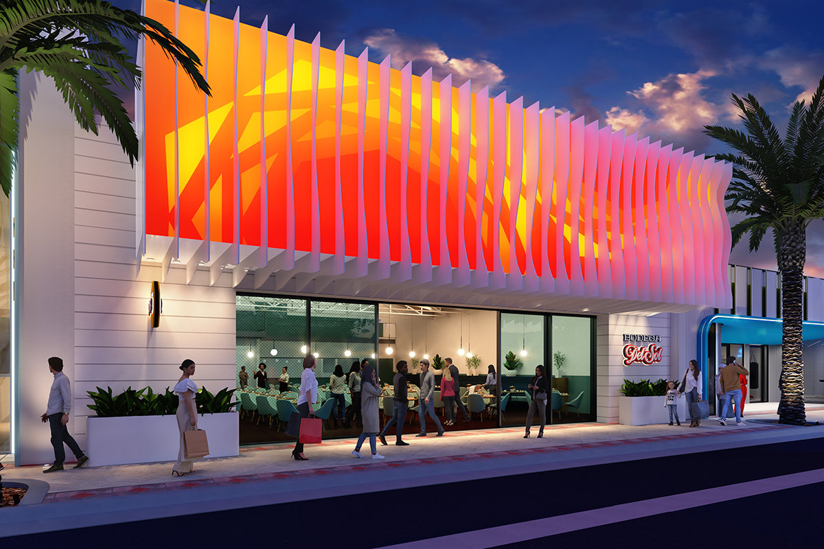Above, a sculptural marquee extends along the façade, providing shade while establishing a strong horizontal presence.